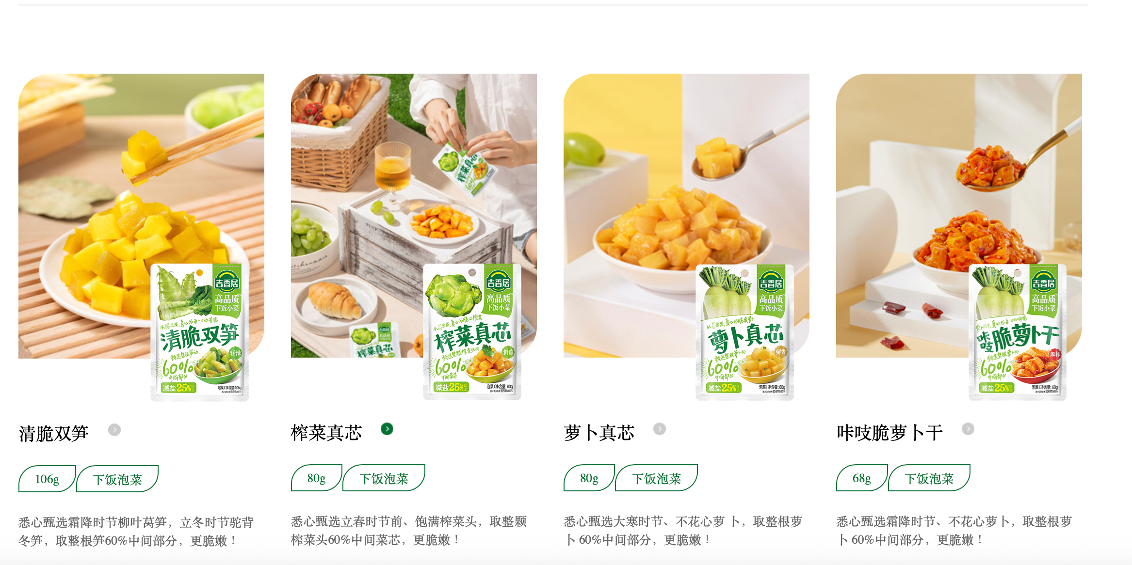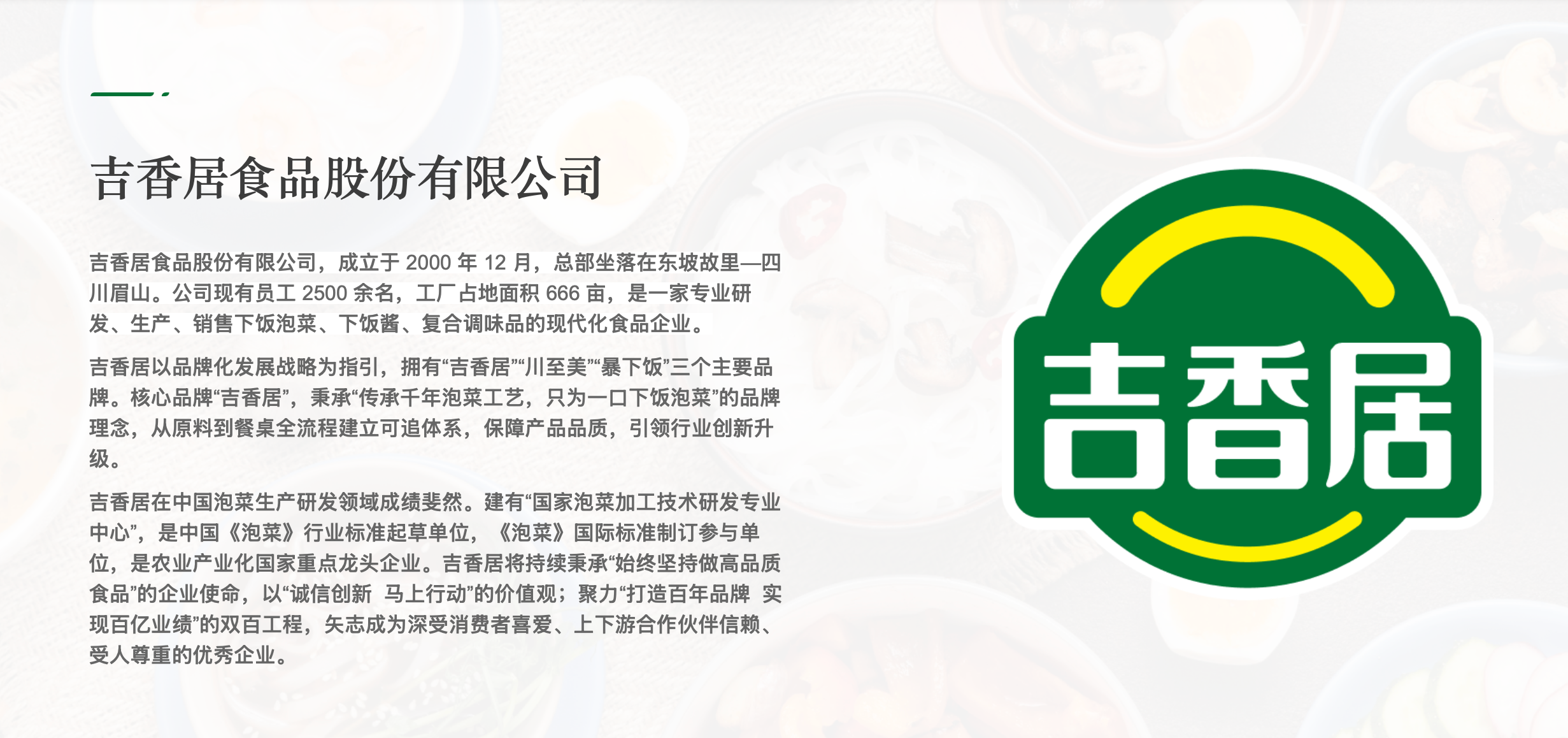 20多年发展,吉香居顽强成为一家专科研发、分娩、销售下饭泡菜、下饭酱、复合调味品的当代化食物企业,置身泡菜行业头部和川味调味料鸿沟的“扛把子”。当今,该公司领有“吉香居”“川知交意思”“暴下饭”三个主要品牌,其开味泡菜、红油豇豆等产品不仅在国内畅销,也翻开了大众20余个国度的市集。值得一提的是,吉香居不仅成为中国《泡菜》行业步伐草拟单元,更是《泡菜》国外步伐制定的参与单元。