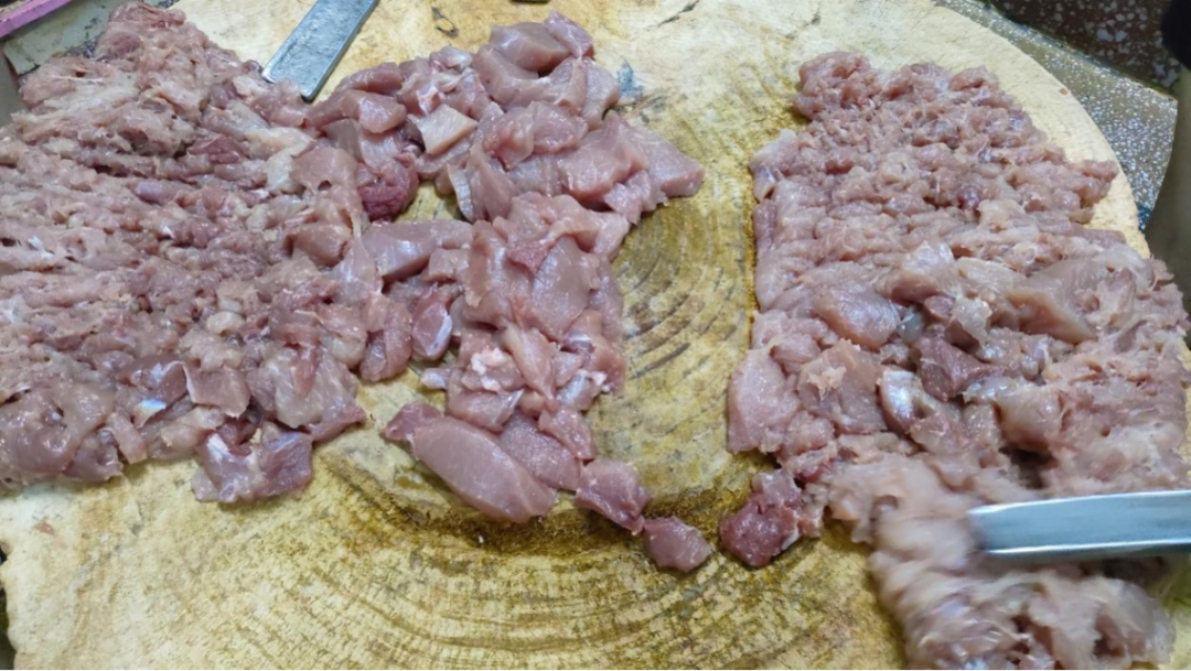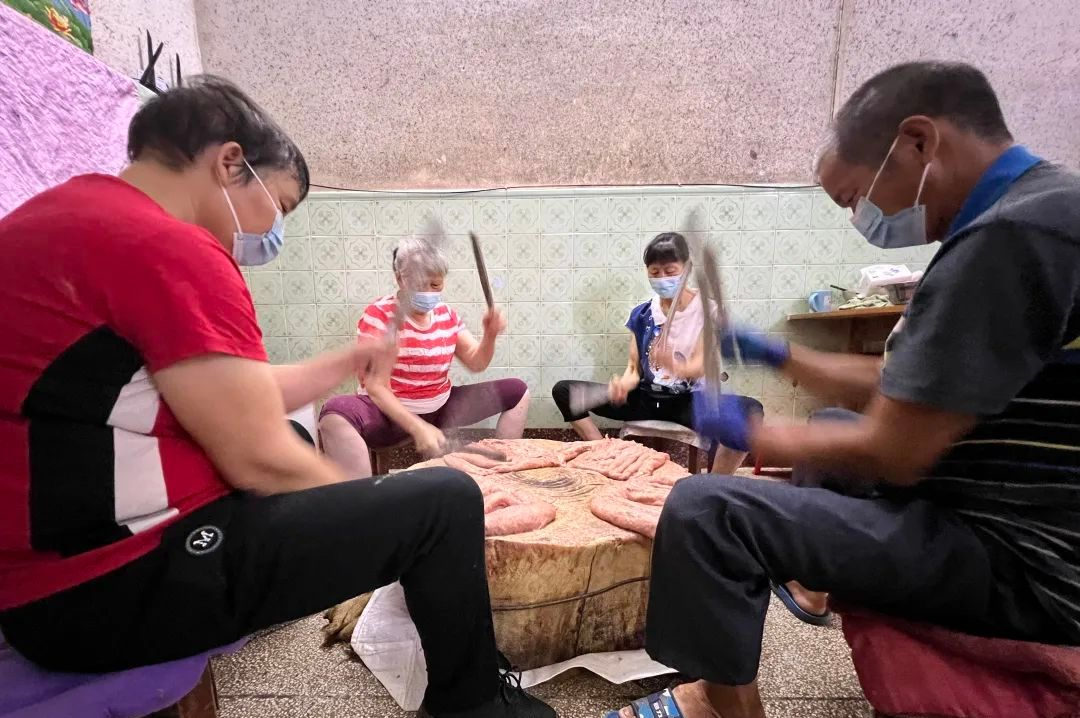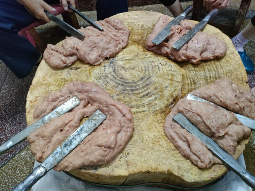 2. 手工捶打:剔除猪肉筋膜后,以铁棒反复捶打20分钟以上,直至肉糜昌盛起胶——手工捶打的力谈能充分开释肉卵白,酿成雅致网状结构,这是机器加工无法复制的弹性根源,亦然老匠东谈主“捶打要够力”的信守。