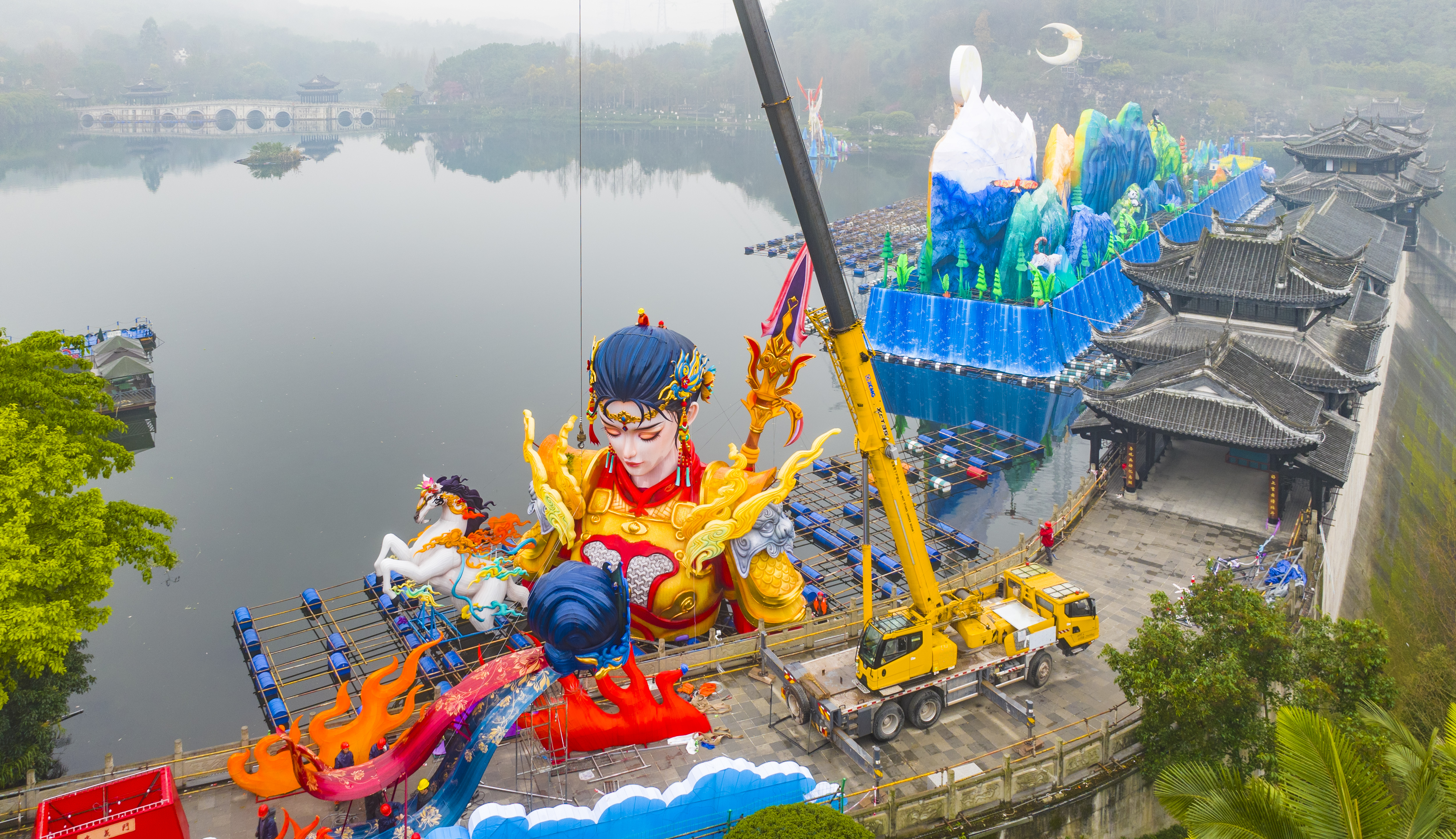 ▲2026重庆市新春灯会——“禧欢霓”园博园大型水上灯会,工东谈主们正在攥紧搭建《巾帼良玉》灯组。记者 皆岚森 摄/视觉重庆