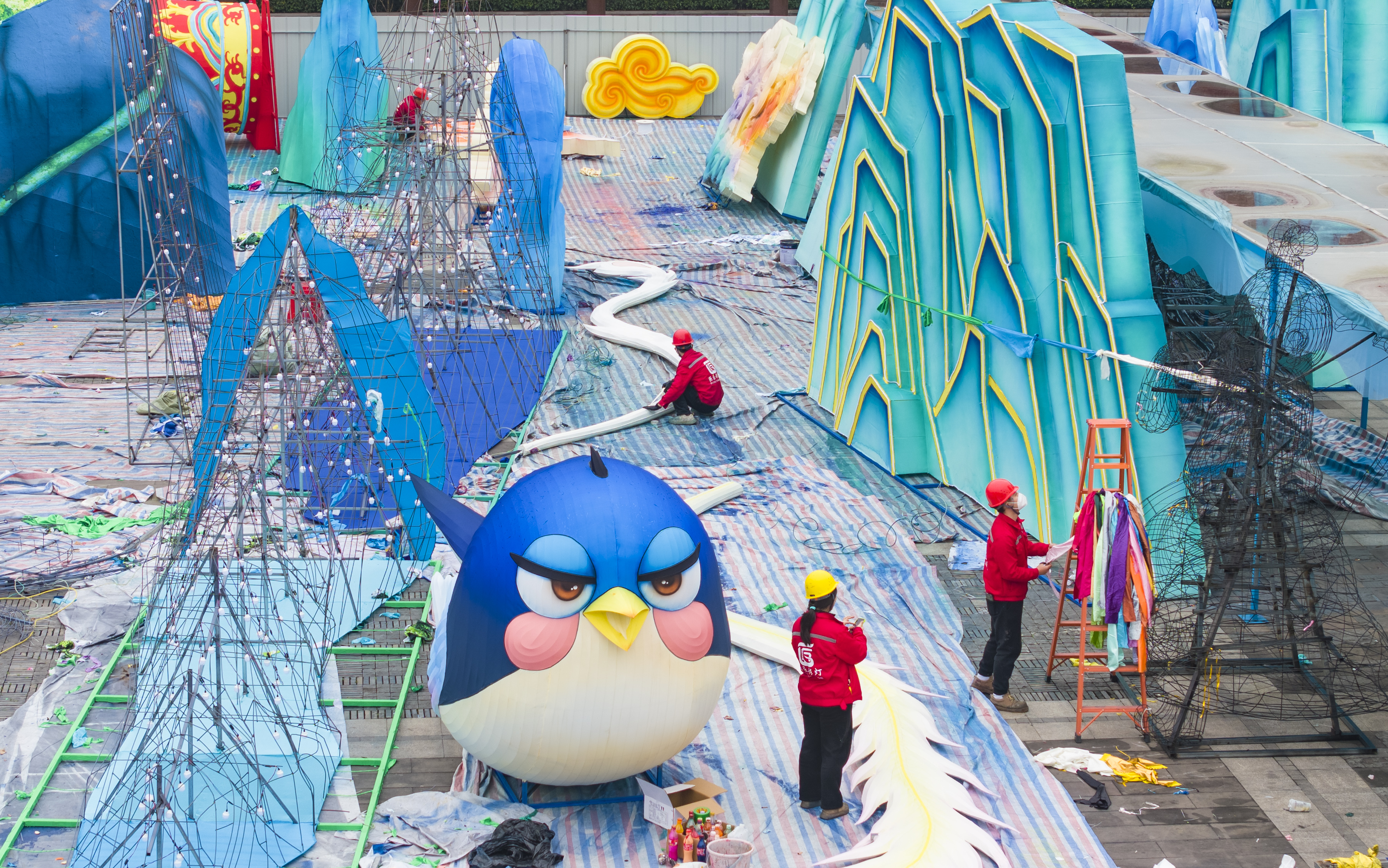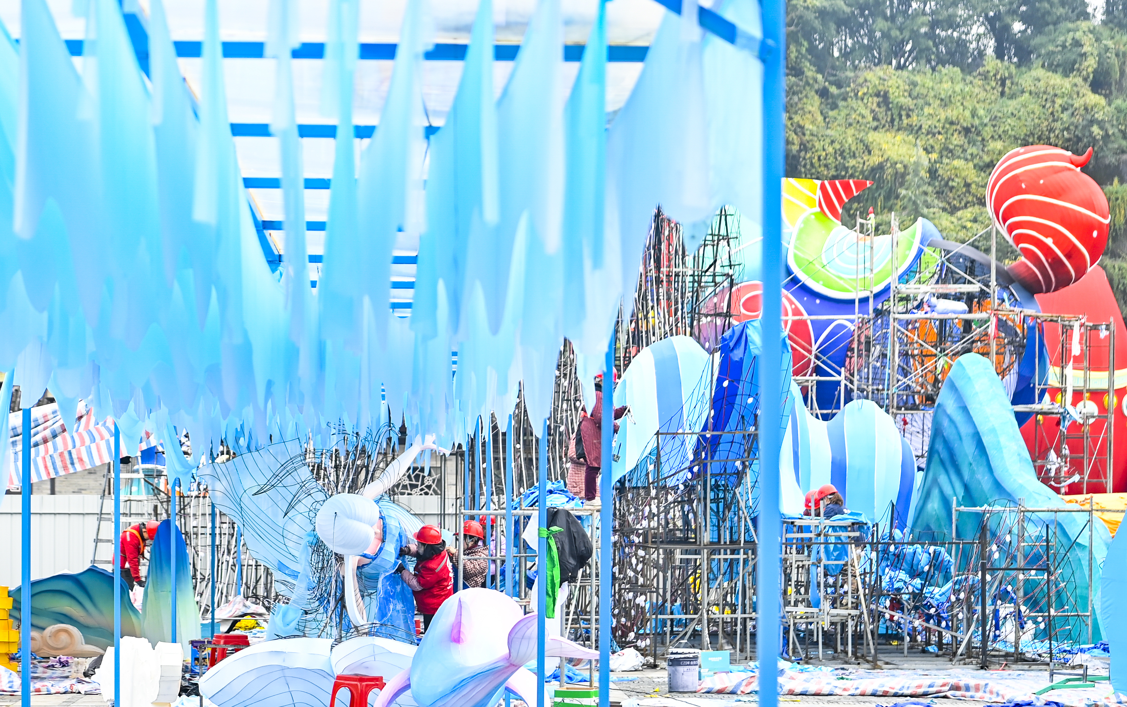 ▲重庆园博园,2026重庆市新春灯会——“禧欢霓”园博园大型水上灯会现场,来无礼庆、自贡两地的400余名匠东谈主正并肩赶工,一盏盏色调斑斓的灯组令东谈主赏心颜面,新春氛围感扑面而来。(无东谈主机像片)记者 皆岚森 摄/视觉重庆