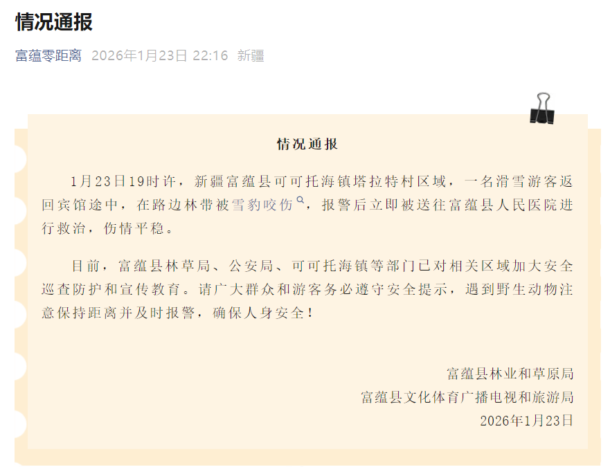 1月23日,新疆富蕴县发布情况通报,当日19时许,该县可可托海镇塔拉特村,别称滑雪旅客复返宾馆途中被雪豹咬伤,报警后立即送往病院救治,伤情清静。