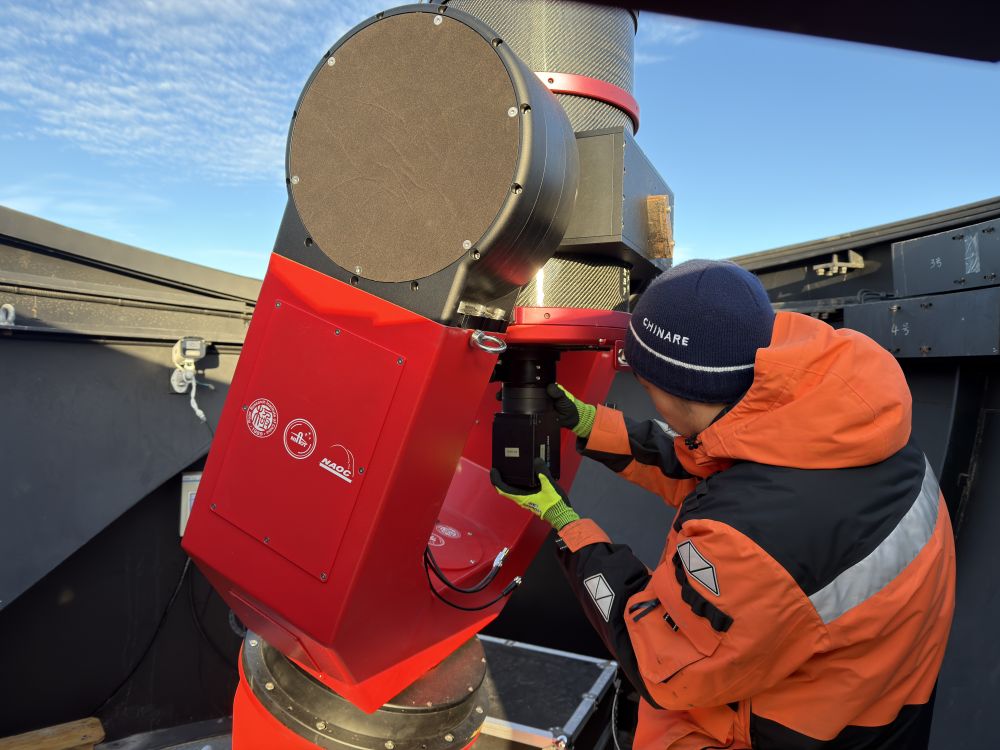 2026年1月,中国第42次南极检会队队员周星宇在南极中山站爱戴天文千里镜。(受访者供图)