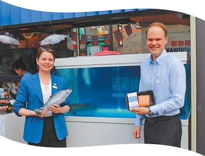童安睿(右)在“Norway Now挪威潮”市集上,向顾主先容产自中国东海的衍生三文鱼。 诺帝克水产(宁波)有限公司供图
