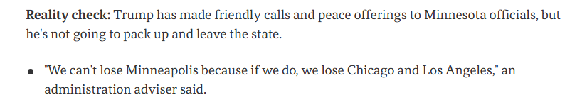 报谈还分析以为,总体来看,特朗普但愿联邦侨民功令东谈主员从明尼苏达州撤除的经过中作念到“体面和平”,况兼他不念念让撤除看起来像侨民计谋失败或政府解救率的大幅下跌所致。但事实上,特朗普不会确切放置并离开这个州。一位好意思国政府照应人就示意:“咱们不成失去明尼阿波利斯,因为一朝失去它,咱们也就失去了芝加哥和洛杉矶。”