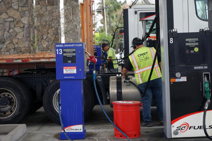3月31日,在好意思国加利福尼亚州蒙罗维亚市的一座加油站,司机为卡车加油。新华社发(曾慧摄)
